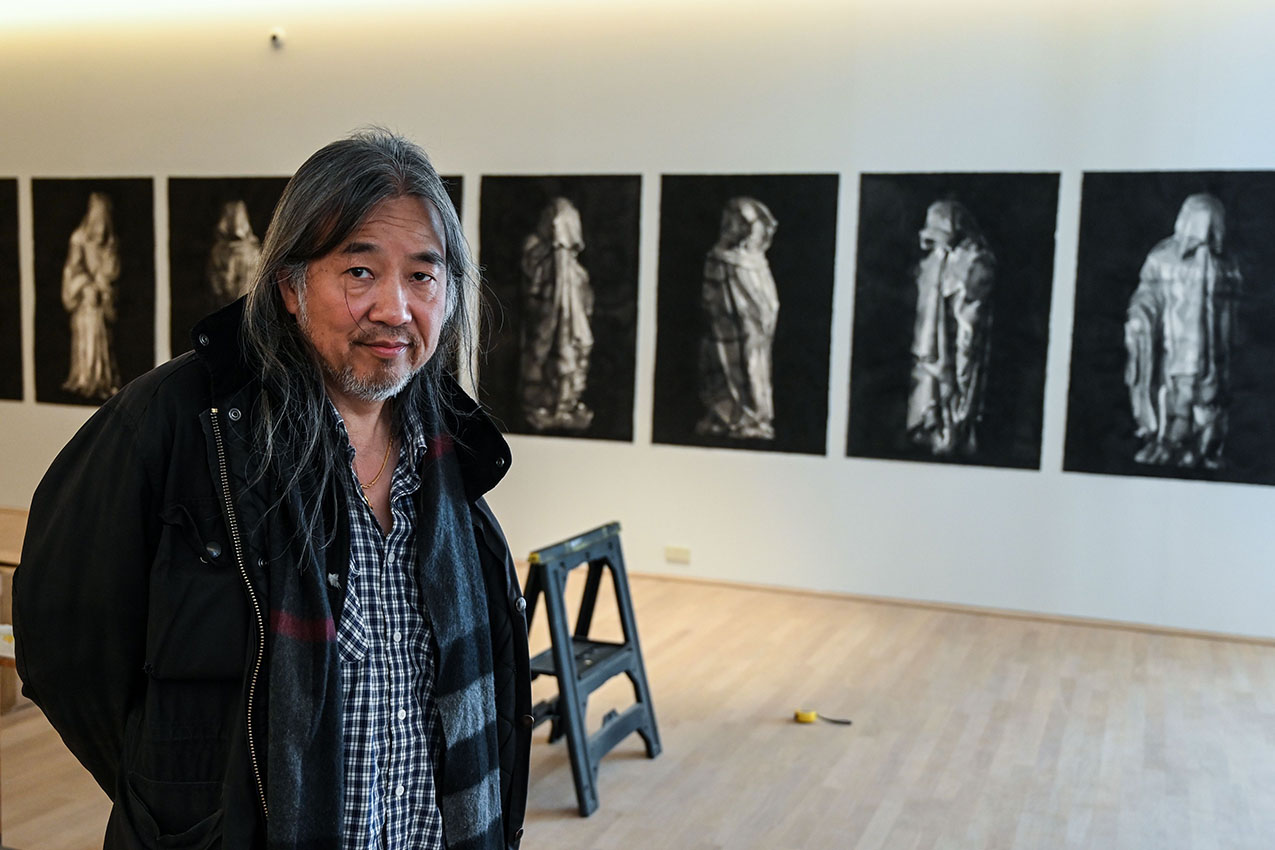 القاهرة : تشكيل . قدم الفنان الفرنسي الصيني يان بي مينغ Yan Pei-Mingجلسة تصوير في متحف ديكس للفنون في ديجون ، في 18 أبريل 2019 ، أمام صور والدته التي توفيت قبل أسبوعين . اللوحة التي أطلق عليها الفنان اسم " Ma Mere أنا مجرد " (2018) جاءت بالأبيض والأسود ، وكانت عبارة عن وجه الأم مع التركيز على العينين ، واعتمد الفنان