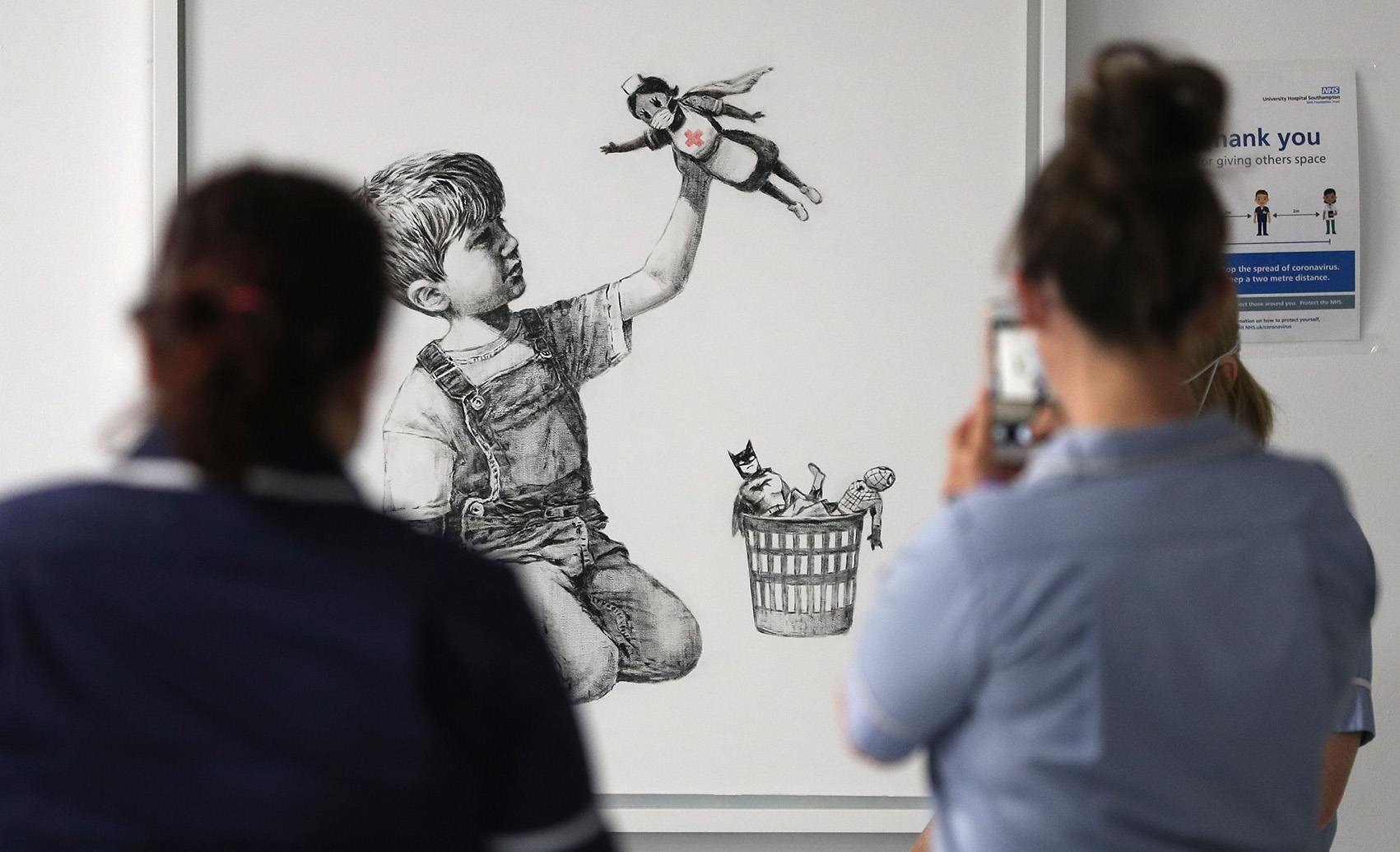 القاهرة : الأمير كمال فرج. في عام 2018 ، تعرضت لوحة رسمها الفنان البريطاني الغامض بانكسي إلى التدمير الذاتي أثناء وجودها في ساحة المزاد في دار سوذبي للمزادات في لندن، وأثار ذلك جدلا فنيا حينئذ. كتب جيمس تارمي في تقرير نشرته مجلة Fortune أن " العمل الفني المطلي بالرش والذي يمثل فتاة تحمل بالونًا والذي بيع بحوالي مليون جنيه إسترليني (1.4 مليون