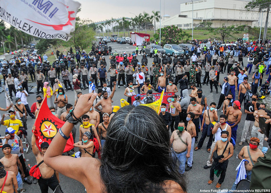 القاهرة : الأمير كمال فرج.تظاهر آلاف من الأندونيسيين ، منهم أعضاء نقابات العمال الإندونيسية وطلاب جامعيين ، أمس، احتجاجا على الإصلاحات العمالية المقترحة من الحكومة في مشروع قانون مثير للجدل بشأن " خلق فرص العمل " في إندونيسيا.ذكر تقرير نشرته Voice of America أن " آلاف الإندونيسيين نزلوا إلى شوارع عدة مدن الثلاثاء في إضراب وطني للاحتجاج على قانون الوظائف الجديد الذي يقولون