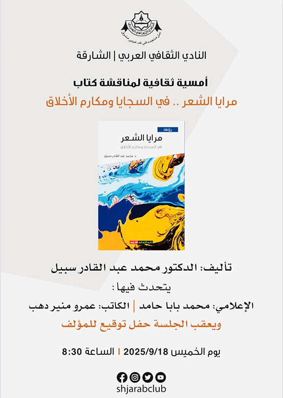نظم النادي الثقافي العربي في الشارقة جلسة نقاشية مميزة، احتفت بكتاب "مرايا الشعر.. في السجايا ومكارم الأخلاق" للدكتور محمد عبد القادر سبيل، الصادر عن دائرة الثقافة بالشارقة عام 2022.