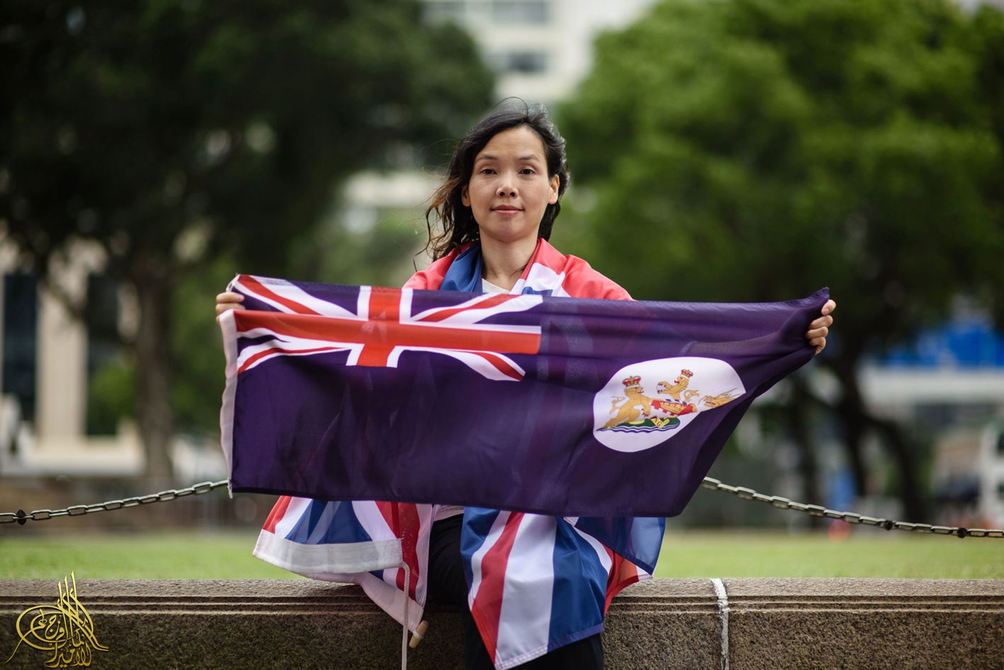ووقفت لاي في ساحة تمثال في هونغ كونغ أمس وهي تحمل العلم الاستعماري البريطاني القديم لهونغ كونغ ، بينما كانت ترتدي العلم الوطني البريطاني الذي يلف حول كتفيها.