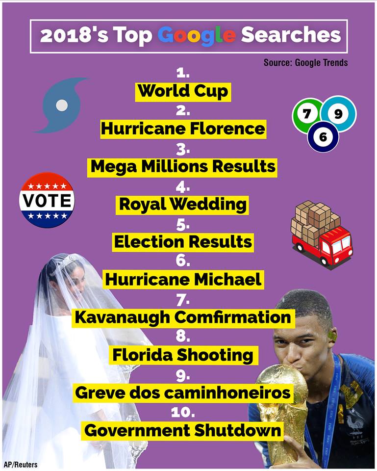 فيما يلي أهم 10 موضوعات وأخبار وأشخاص والسياسة والأفلام تم البحث عنها في 2018: