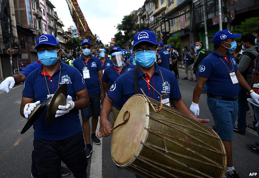 شارك العشرات من المواطنين في سحب عربة تقليدية خلال مهرجان عربة ماتشيندراناث راتو (الأحمر) بعد أن فرضت الحكومة حظراً على التجمعات العامة كإجراء وقائي ضد جائحة فيروس كورونا ، في لاليتبور ، نيبال ، أمس .